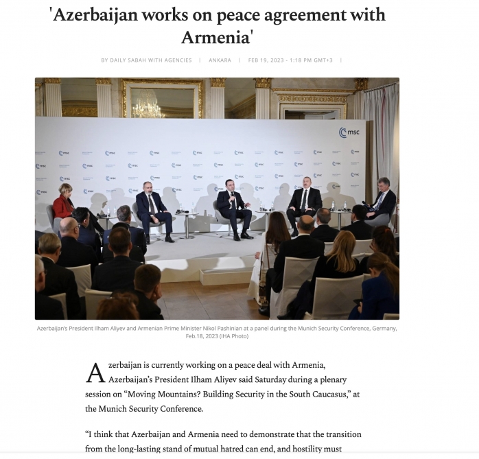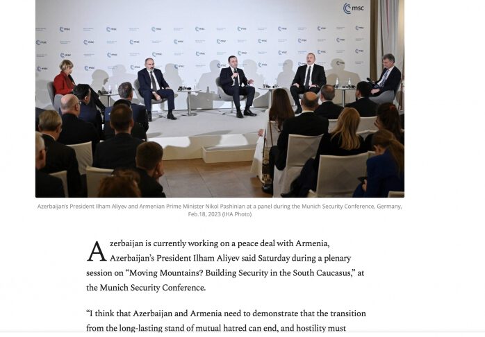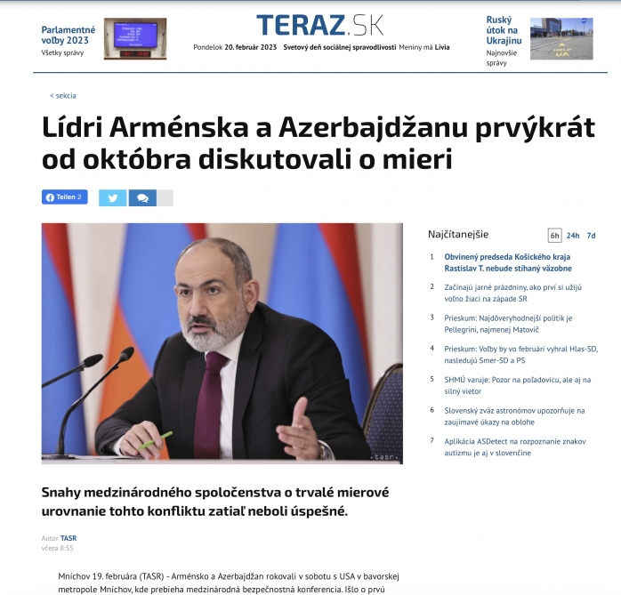 Slovakiyanın “teraz.sk“ portalında yerləşdirilmiş “Azərbaycan və Ermənistan liderləri oktyabrdan bəri ilk dəfə sülh barədə müzakirələr aparıblar” sərlövhəli məqalədə Münxendə üçtərəfli görüşdən ətraflı bəhs edilib. Məqalədə Azərbaycanın sülhpərvər niyyəti və sülh danışıqlarına sadiqliyi dövlətimizin başçısı İlham Əliyevin fikirləri ilə aydın şəkildə ifadə edilib: “Düşünürəm ki, bu, (sülh sazişi – red.) ciddi tarixi fikir ayrılığına malik olan ölkələrin bir araya gəlməsi və düşmənçilik səhifəsinin bağlanmasında yaxşı nümunə ola bilər”.