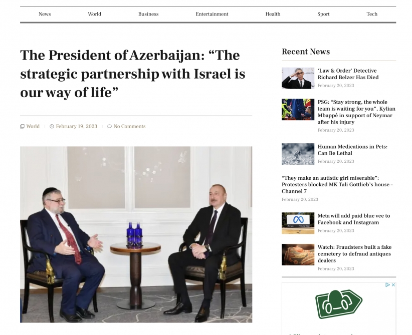 “Time.news” portalında yayımlanan “Azərbaycan Prezidenti: İsrail ilə strateji tərəfdaşlıq bizim həyat tərzimizdir” sərlövhəli məqalədə isə Münxendə Azərbaycan Prezidenti İlham Əliyev və Avropa Ravvinləri Konfransının prezidenti Pinhas Qoldşmit arasında görüş, Azərbaycandakı yəhudi icmasına münasibət və eləcə də Azərbaycan-İsrail əlaqələri diqqət mərkəzində olub. Qeyd edilib ki, Azərbaycan ilə İsrail arasında müxtəlif sahələrdə mövcud olan strateji tərəfdaşlıq və uğurlu dostluq min illərdir bizim həyat tərzimizə çevrilib. Azərbaycan ölkədəki sinaqoqların normal fəaliyyəti üçün hər cür şəraiti yaradır. Azərbaycanın İsraildə səfirliyinin açılması bu əlaqələri daha da inkişaf etdirəcək.