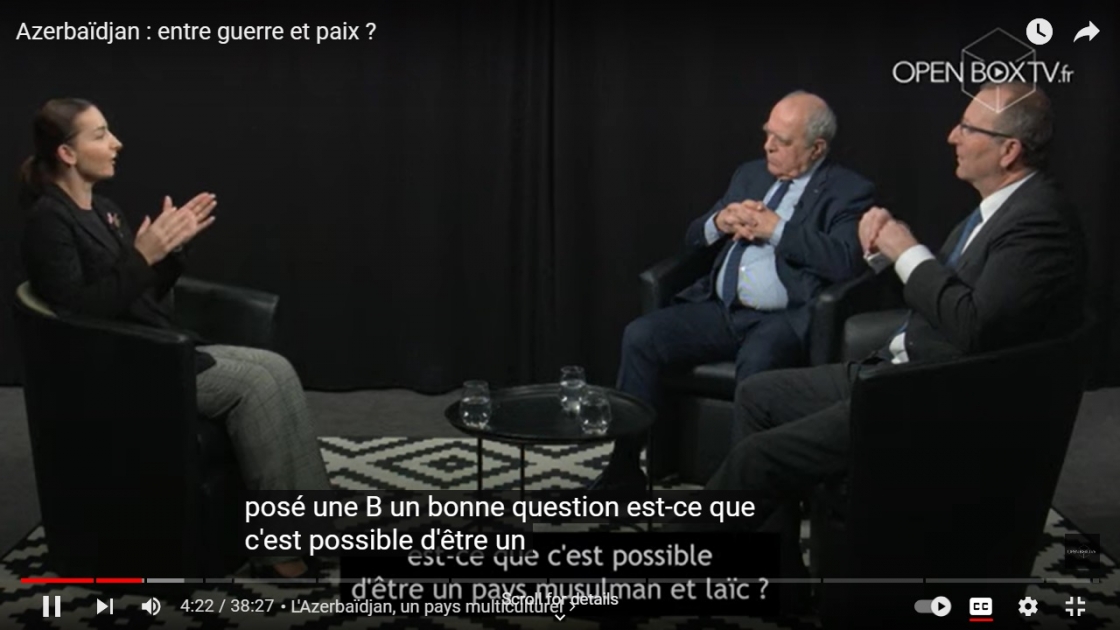 Azərbaycanın Fransadakı səfiri Leyla Abdullayeva bu ölkənin “Openboxtv” telekanalında Fransa Xarici Təhlükəsizlik Baş İdarəsinin sabiq kəşfiyyat direktoru, Baş nazirin iqtisadi intellekt üzrə sabiq məsul rəhbəri Alən Juiyenin (Alain Juillet) qonağı olub.