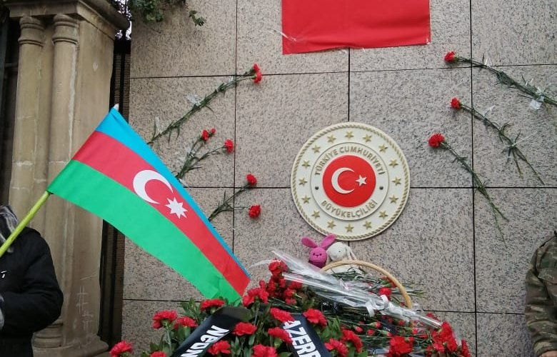 Hazırda da paytaxt sakinləri səfirlik önünə gələrək əklil və gül dəstələri düzürlər.
