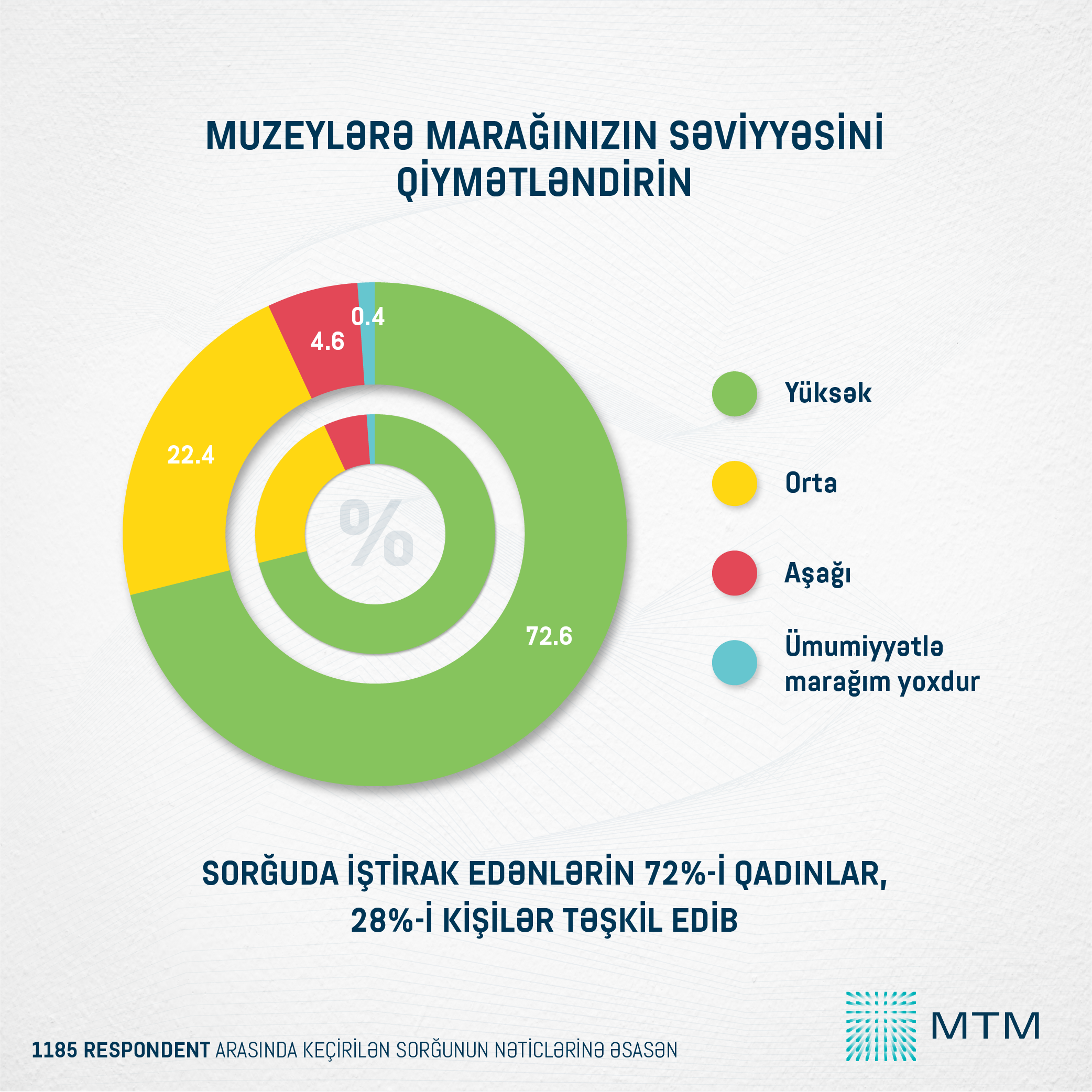 Respondentlərin 72,6%-i muzeylərə yüksək maraq göstərdiyini bildirib. Bu göstərici onu deməyə əsas verir ki, muzeylər artıq yalnız “keçmişi qoruyan səssiz məkanlar” kimi qəbul edilmir. Cəmiyyət onları bilik, düşüncə və identiklik formalaşdıran canlı platformalar kimi görür. Sürətli informasiya axını şəraitində insanların daha dərin, etibarlı və konteksti olan mənbələrə üz tutması bu marağın əsas səbəblərindən biridir.