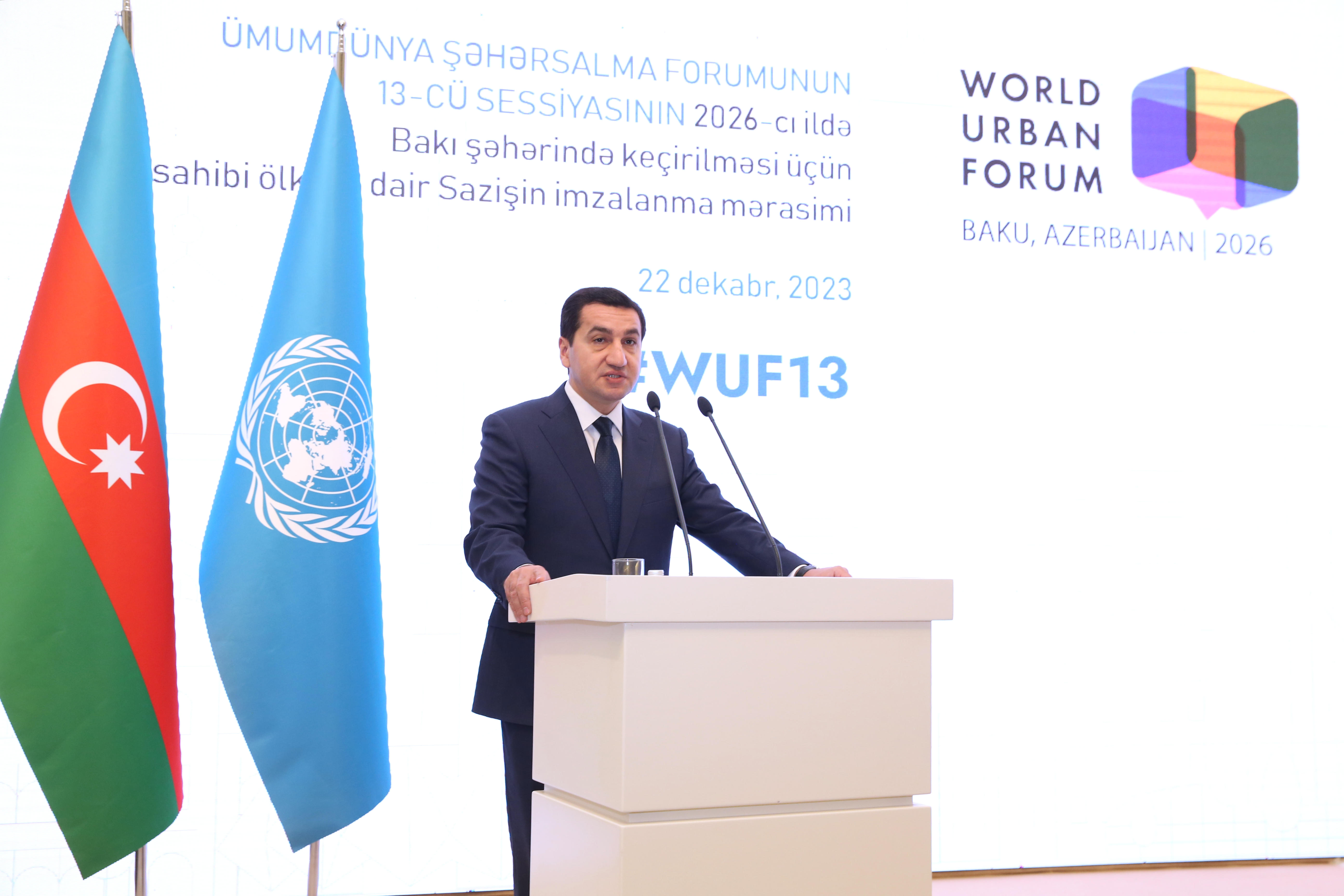 İmzalanma mərasimində çıxış edən Azərbaycan Respublikası Prezidentinin köməkçisi, Prezident Administrasiyasının Xarici siyasət məsələləri şöbəsinin müdiri Hikmət Hacıyev mühüm və qlobal xarakterli tədbir olan Ümumdünya Şəhərsalma Forumunun 2026-cı ildə məhz Bakıda keçirilməsinin Azərbaycan hökumətinin şəhərsalma sahəsində apardığı dərin islahatlar və genişmiqyaslı layihələr, habelə ölkəmizin bu sahədə qlobal gündəliyə verdiyi töhfələr sayəsində beynəlxalq nüfuzunun ən yüksək səviyyədə olmasının bariz nümunəsi olduğunu bildirib. Həmçinin Ümumdünya Şəhərsalma Forumu və COP29 kimi nəhəng tədbirlərin Azərbaycanda keçirilməsindən böyük məmnunluq duyduğunu qeyd edib.