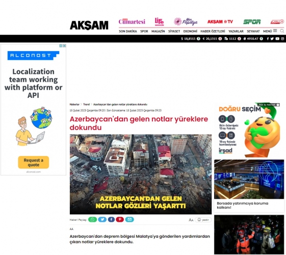 “aksam.com.tr” portalında yayımlanan “Azərbaycandan gələn məktublar qəlbləri riqqətə gətirdi” sərlövhəli məqalədə isə Azərbaycandan qardaş ölkəyə göndərilən yardımlar arasında yer alan məktubların qəlbləri riqqətə gətirdiyi qeyd olunub. Bildirilib ki, qardaş ölkədən yardımlar gəlməyə davam edir. Azərbaycandan göndərilən məhsullar zəlzələdən zərər çəkənlərə paylanılıb. Yardımlar arasında göndərilən məktublardan birində yazılıb: “Keçmiş olsun, Azərbaycan olaraq ürəyimiz səninlədir. Çox gözəl günlərdə istifadə etməyinizi arzu edirəm. Qardaşlarımız, Allah sizi qorusun. Biz sizinləyik, siz dualarımızdasınız”.