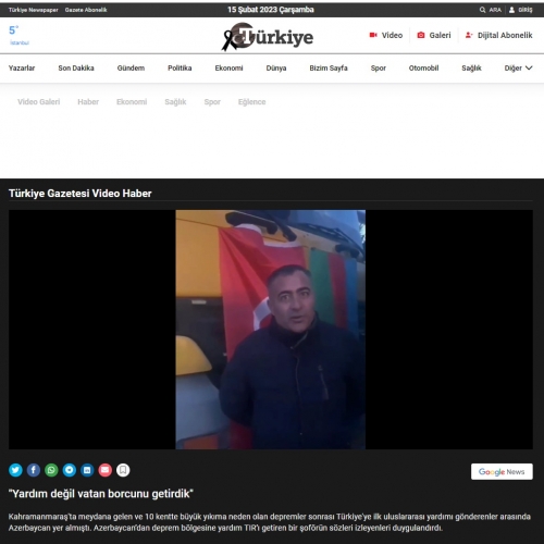 “turkiyegazetesi” qəzetinin saytında yayımlanan videoda Azərbaycandan, Naxçıvandan Türkiyəyə yardım gətirən TIR sürücüsünün müsahibəsi təqdim edilib. O, Türkiyəyə gəlməyinin məqsədini bu sözlərlə izah edib: “Biz Türkiyəyə Nuru Paşanın, Ömər Halisdemirin, Kazım Qarabəkirin, Mübariz İbrahimovun, Fərid Əhmədovun borcunu gətirdik. Biz buraya yardım gətirmədik, biz buraya Vətənin borcunu gətirdik, qardaşlar. Biz gəldik burada Vətən daşı olaq, Vətənə xidmət edək. Biz buraya qardaşın övladları olaraq gəldik”.