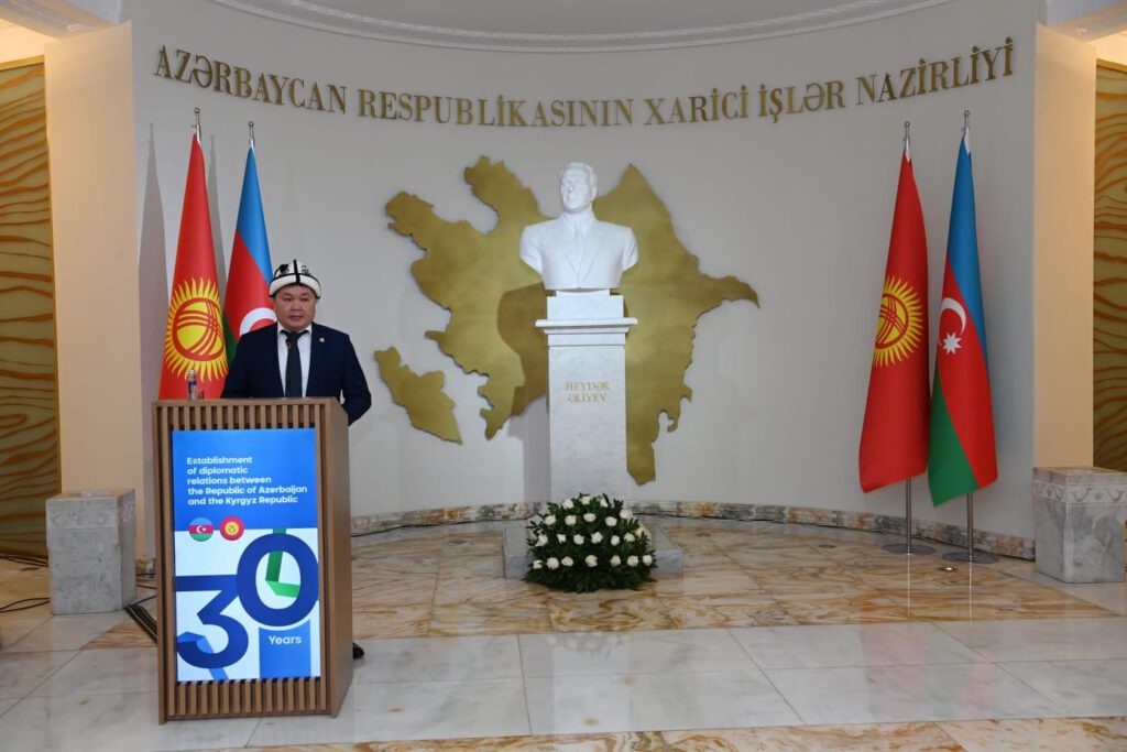 Daha sonra çıxış edən Qırğız Respublikasının Azərbaycan Respublikasındakı Fövqəladə və Səlahiyyətli Səfiri Kayrat Osmonalıyev iki ölkə arasında diplomatik münasibətlərin qurulmasının 30-cu ildönümü münasibətilə təbriklərini tədbir iştirakçılarının diqqətinə çatdırıb. Ölkələrimiz arasında diplomatik əlaqələr yarandığı gündən Qırğızıstan-Azərbaycan ikitərəfli əməkdaşlığının qarşılıqlı faydalı tərəfdaşlıq, dostluq əsasında qurulduğunu və bütövlükdə siyasi, ticarət-iqtisadi, elmi-texniki, mədəniyyət və digər sahələrdə uğurla inkişaf etdiyini qeyd edib. Hər iki ölkənin məqsədinin türk dünyasının inkişafına, siyasi və mədəni birliyinə töhfə vermək olduğunu qeyd edən səfir, ötən il Prezident İlham Əliyevin Qırğız Respublikasına dövlət səfərinin, imzalanan sənədlər və liderlərin səsləndirdiyi fikirlərin iki qardaş ölkənin münasibətlərində yeni mərhələnin əsasını qoyduğunu bildirib.