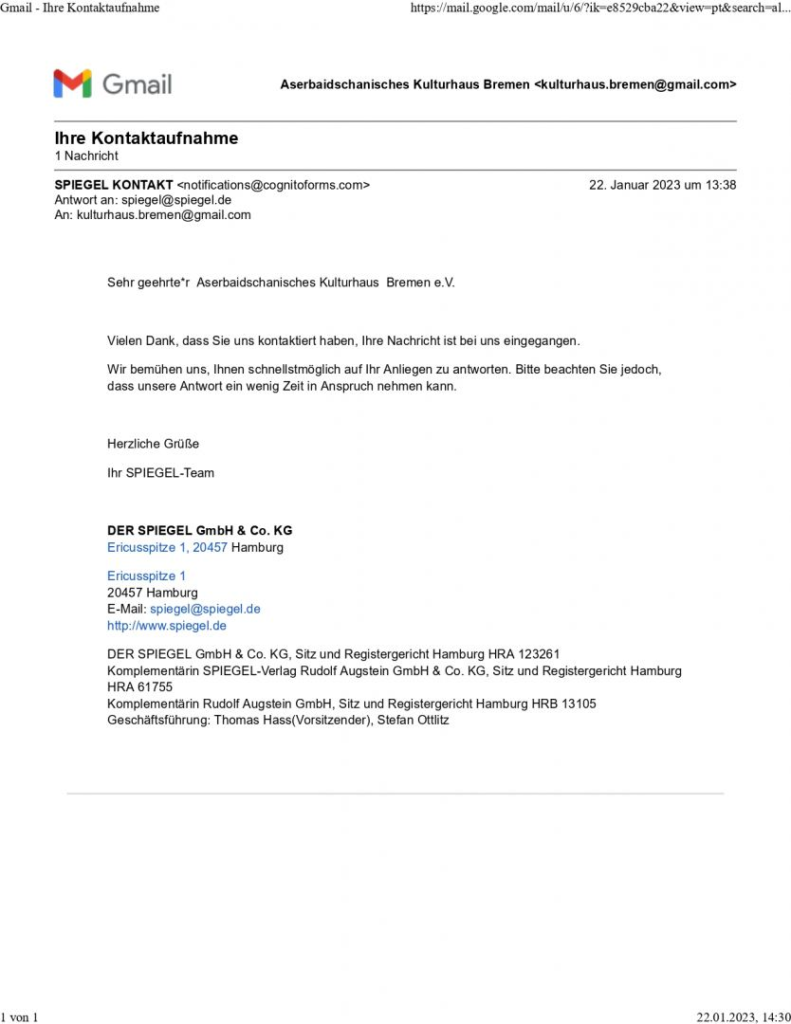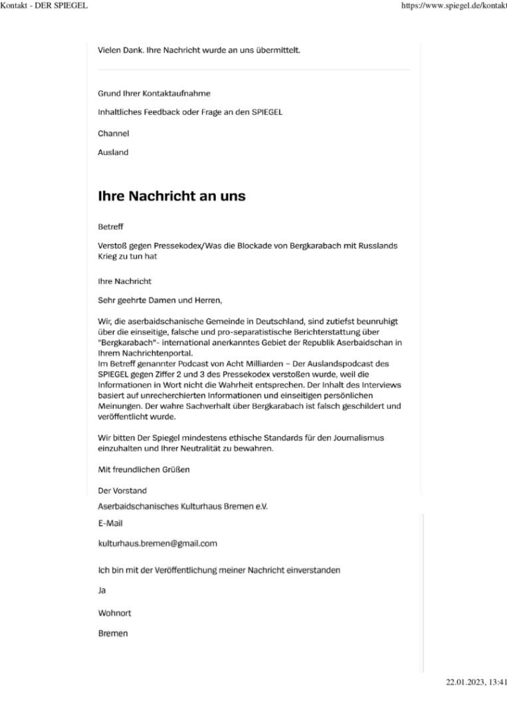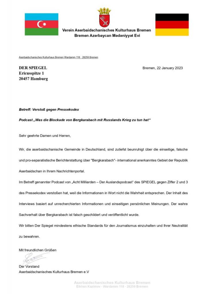 Diasporla İş üzrə Dövlət Komitəsindən verilən məlumata görə, Bremen Azərbaycan Mədəniyyət Evinin adından jurnalın redaksiyasına ünvanlanan məktubda bildirilib ki, Almaniyada yaşayan Azərbaycan icması nəşrin xəbər portalında Azərbaycan Respublikasının beynəlxalq səviyyədə tanınmış ərazisi olan Dağlıq Qarabağla bağlı separatist yönümlü, birtərəfli, yalan reportajların yayılmasından narahatlıq keçirir.