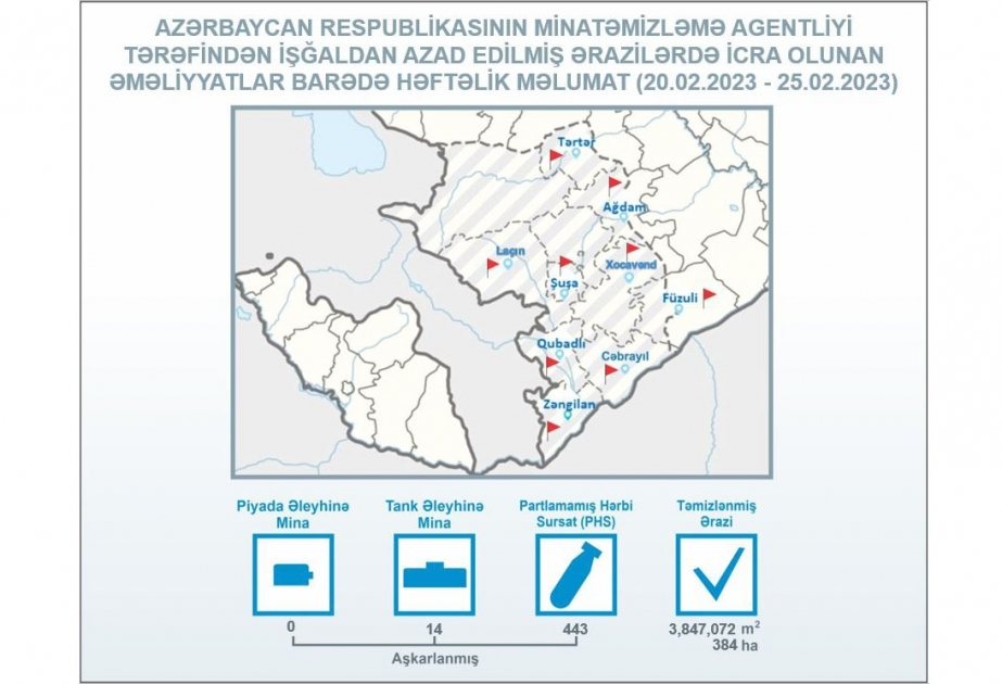 ANAMA-dan verilən məlumata görə, fevralın 20-dən 25-dək Tərtər, Ağdam, Füzuli, Xocavənd, Şuşa, Qubadlı, Laçın, Cəbrayıl və Zəngilanda 14 tank əleyhinə mina və 443 Partlamamış Hərbi Sursat (PHS) aşkarlanıb.