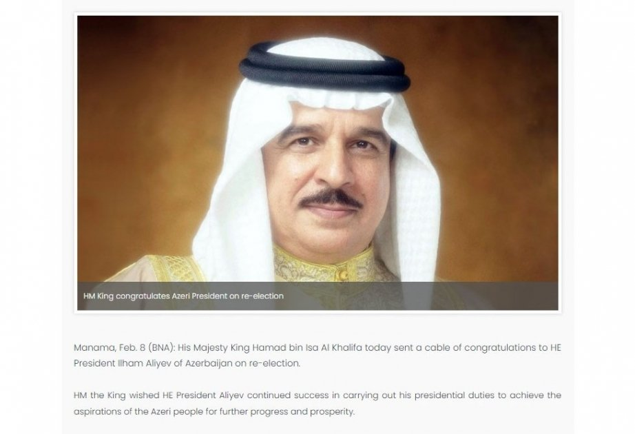 Bəhreynin Kralı Həməd bin İsa Al Xəlifə Azərbaycan Respublikasının Prezidenti İlham Əliyevi növbədənkənar prezident seçkilərində qazandığı parlaq qələbə münasibətilə təbrik edib.