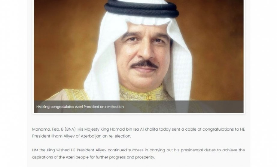 Bəhreynin Kralı Həməd bin İsa Al Xəlifə Azərbaycan Respublikasının Prezidenti İlham Əliyevi növbədənkənar prezident seçkilərində qazandığı parlaq qələbə münasibətilə təbrik edib.
