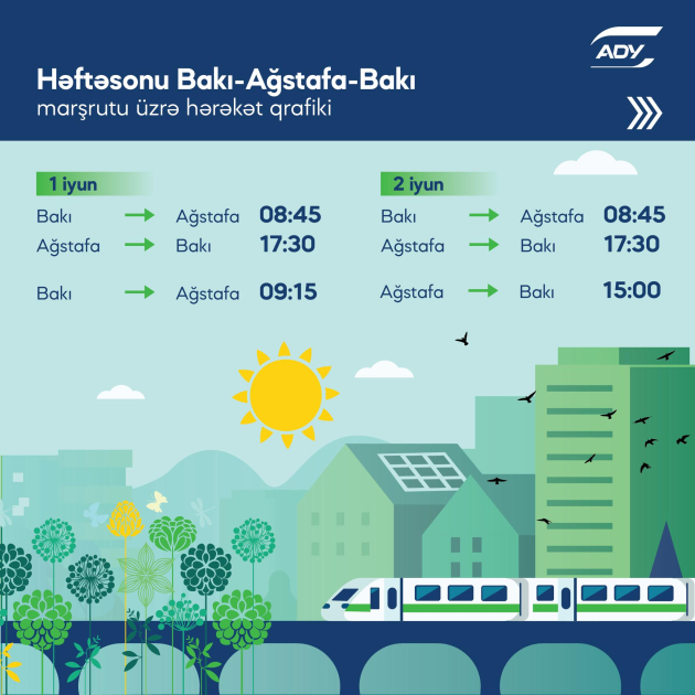 ADY-dən bildirilib ki, Bakı-Ağstafa-Bakı marşrutu üzrə əlavə qatar reysləri həftəsonu günlərinə təyin edilir. Əlavə təyin edilən qatarlar iyunun 1-də saat 09:15-də Bakıdan Ağstafaya, iyunun 2-də saat 15:00-da isə Ağstafadan Bakıya yola düşəcək.