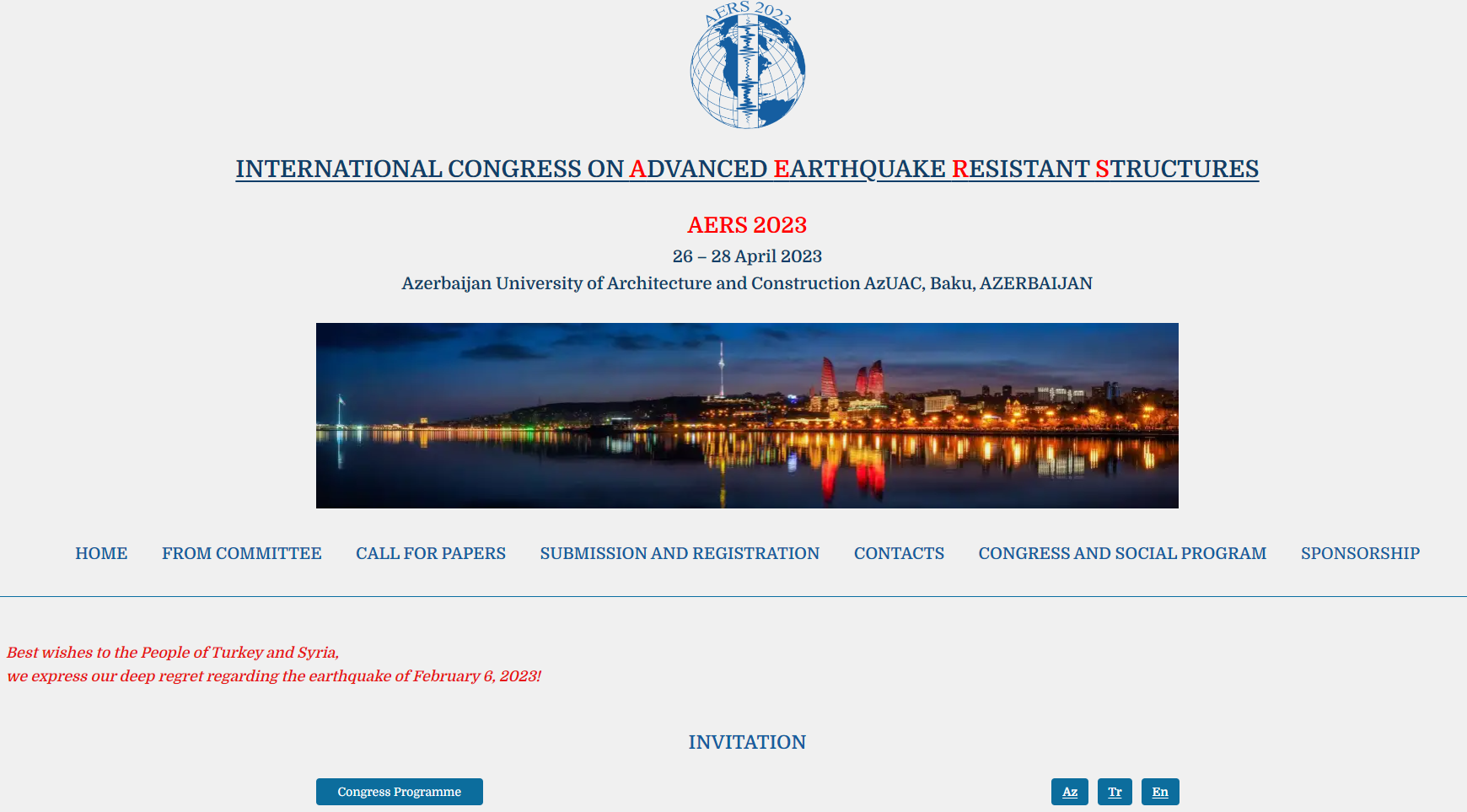 Aprelin 26-da Bakıda Azərbaycan Memarlıq ve İnşaat Universitetinin (AzMİU) təşkilatçılığı, Azərbaycan Respublikası Elm və Təhsil Nazirliyi, Azərbaycan Respublikasının Dövlət Şəhərsalma və Arxitektura Komitəsinin dəstəyi ilə “Seysmik Dayanıqlı Müasir Qurğular” (AERS 2023) Beynəlxalq Konqresi keçiriləcək.