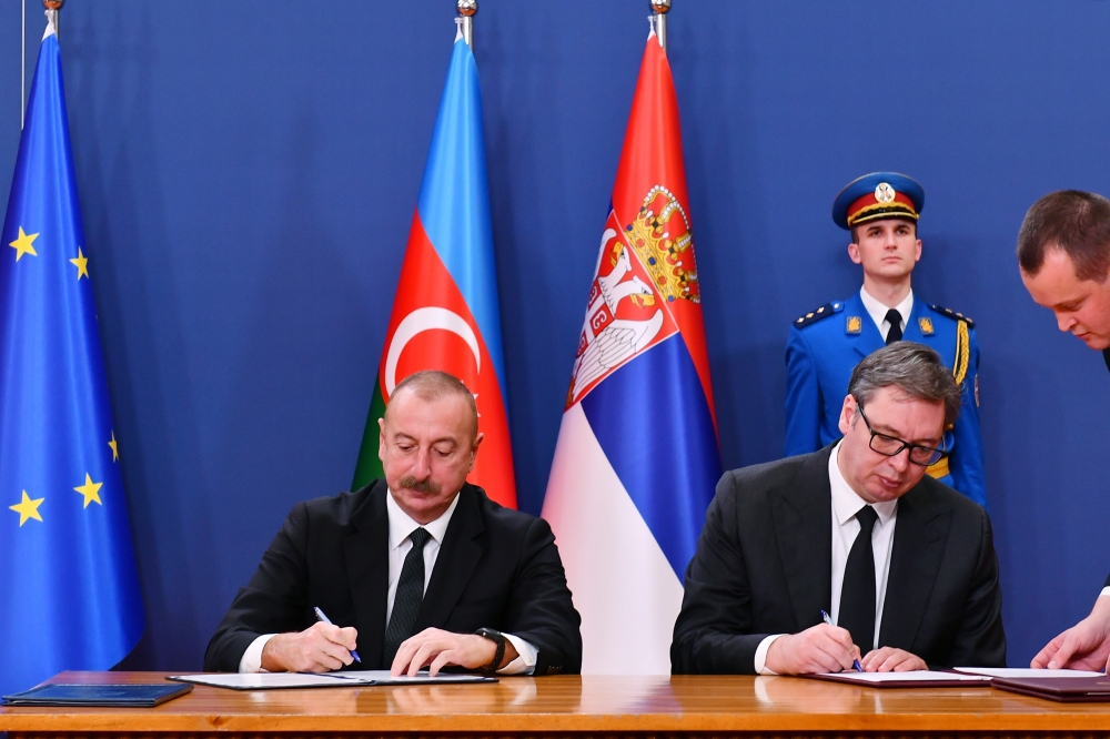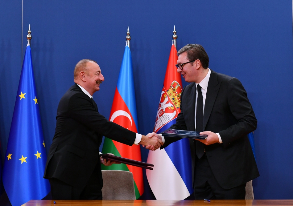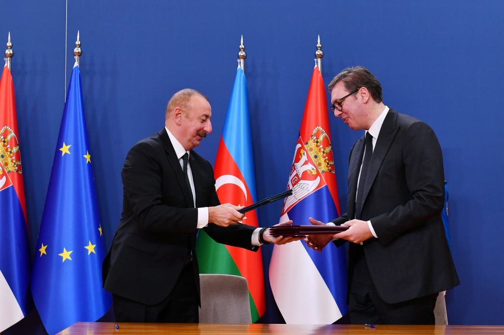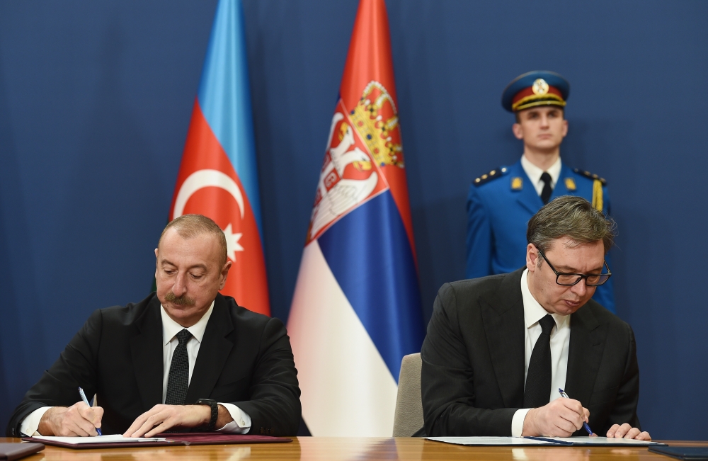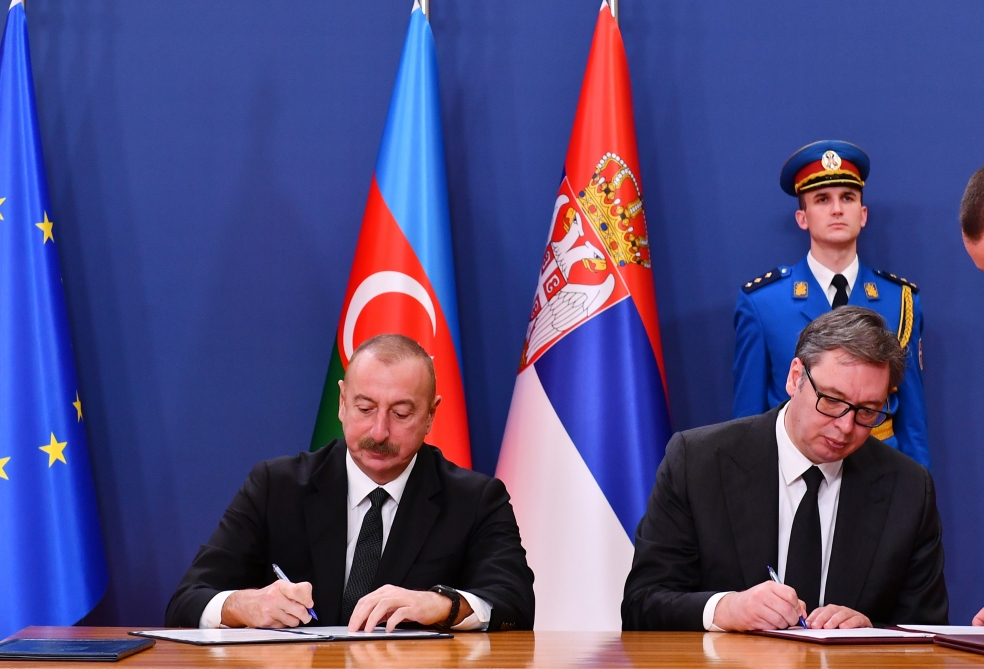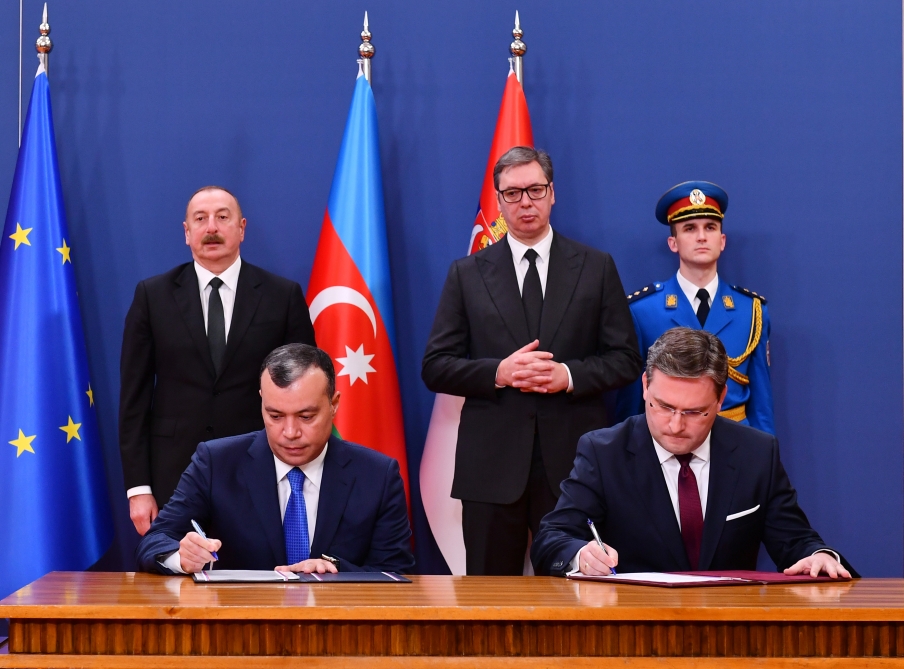 Azərbaycan Respublikasının Prezidenti İlham Əliyev və Serbiya Respublikasının Prezidenti Aleksandar Vuçiç “Azərbaycan Respublikası Prezidenti ilə Serbiya Respublikası Prezidenti arasında Birgə Bəyanat”ı, “Azərbaycan Respublikası və Serbiya Respublikası arasında Strateji Tərəfdaşlıq Şurasının yaradılması haqqında Memorandum”u və onun əlavəsi olan “Azərbaycan Respublikası və Serbiya Respublikası arasında Strateji Tərəfdaşlıq Şurasının Əsasnaməsi”ni imzalayıblar.