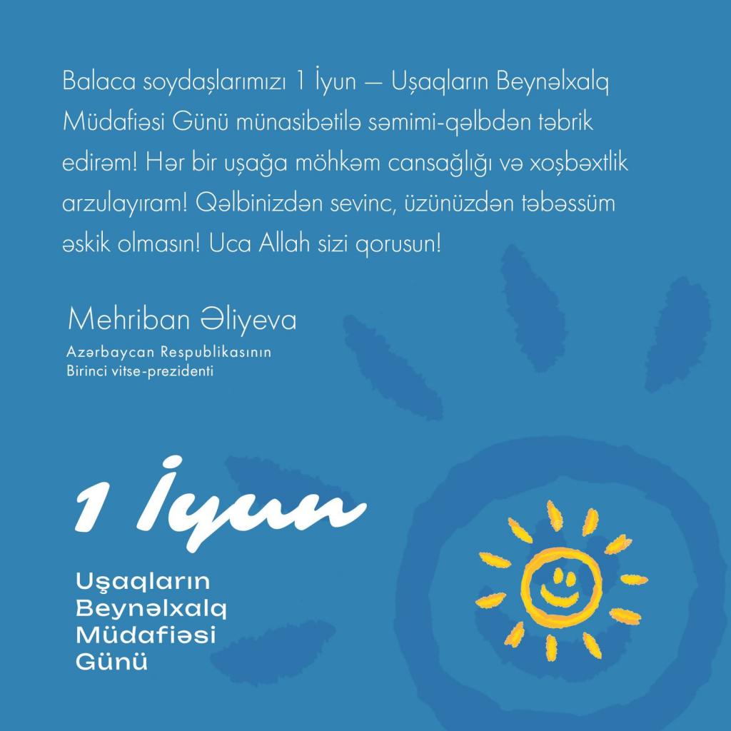 “Balaca soydaşlarımızı 1 İyun – Uşaqların Beynəlxalq Müdafiəsi Günü münasibətilə səmimi-qəlbdən təbrik edirəm! Hər bir uşağa möhkəm cansağlığı və xoşbəxtlik arzulayıram! Qəlbinizdən sevinc, üzünüzdən təbəssüm əskik olmasın! Uca Allah sizi qorusun!”
