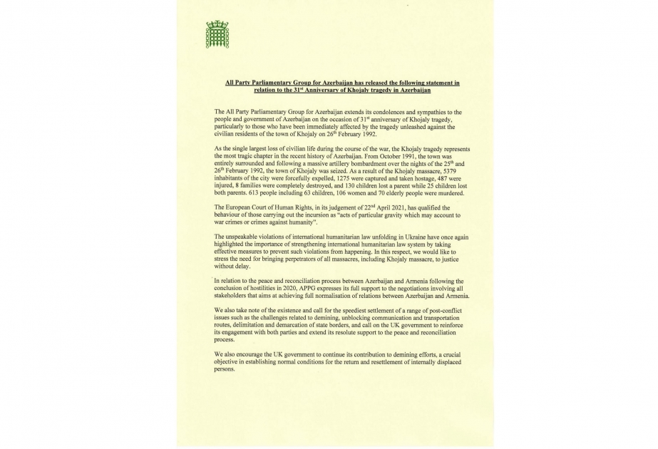 Böyük Britaniya-Azərbaycan parlamentlərarası əlaqələr üzrə dostluq qrupu Xocalı faciəsinin 31-ci ildönümü ilə bağlı bəyanat yayıb.