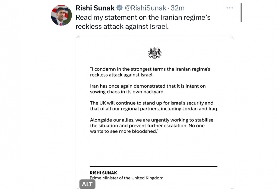 Baş nazir bu barədə özünün “X” social şəbəkə səhifəsində yazıb. O qeyd edib ki, İran bir daha xaos toxumları səpmək niyyətində olduğunu nümayiş etdirib. Rişi Sunak müttəfiq dövlətlərlə birgə təcili olaraq vəziyyəti sabitləşdirmək və gərginliyin daha da artmasının qarşısını almaq üçün çalışdığını deyib.