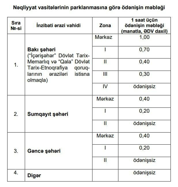 “Nəqliyyat vasitələrinin parklanmasına görə ödənişin məbləği” yalnız dövlətə məxsus parkinqlərdə qüvvədə olacaq. Avtomobillərin parklanmasına görə maliyyə dövriyyəsinin şəffaflaşdırılması, rəqəmsallaşmanın və istifadə rahatlığının təmin edilməsi məqsədilə ödənişlərin yalnız nağdsız qaydada həyata keçirilməsi nəzərdə tutulur.