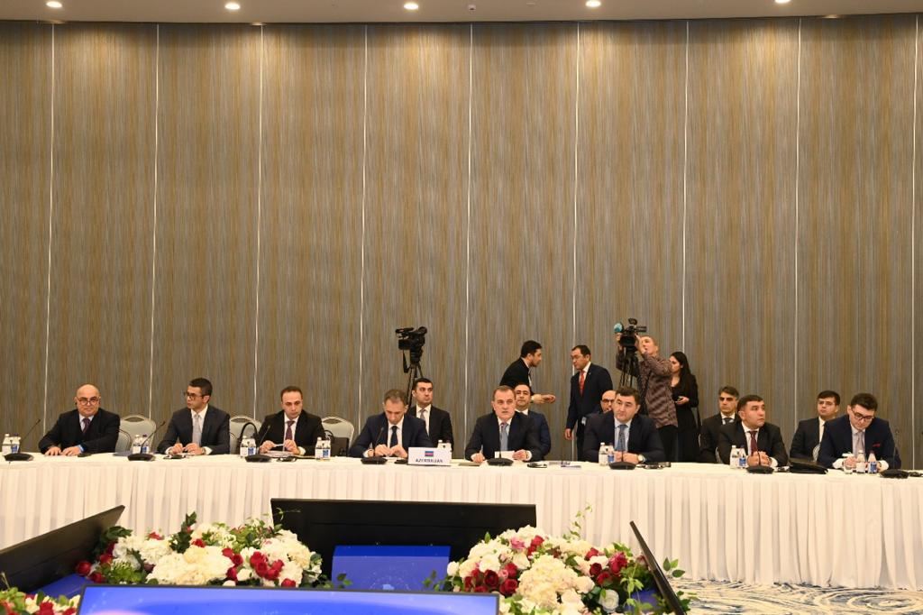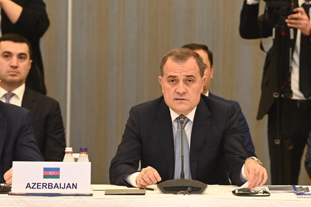 Xarici işlər naziri Ceyhun Bayramov Azərbaycan, Qazaxıstan və Türkiyə xarici işlər və nəqliyyat sahələri üzrə məsul nazirlərinin Aktauda keçirilən 2-ci üçtərəfli görüşündə çıxış edir.