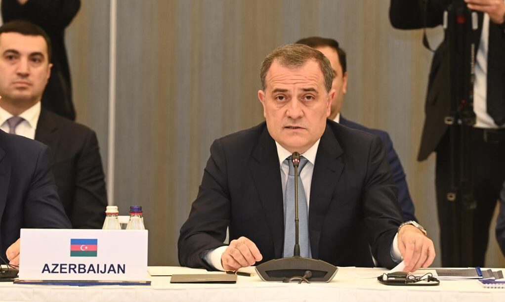 Xarici işlər naziri Ceyhun Bayramov Azərbaycan, Qazaxıstan və Türkiyə xarici işlər və nəqliyyat sahələri üzrə məsul nazirlərinin Aktauda keçirilən 2-ci üçtərəfli görüşündə çıxış edir.
