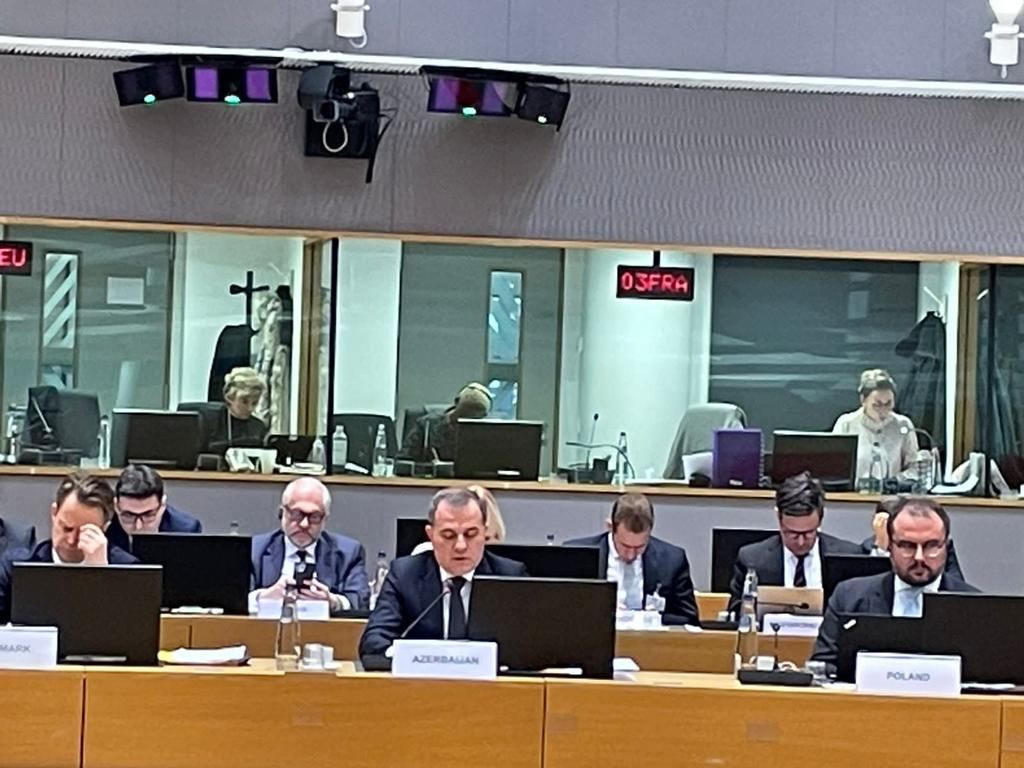 Azərbaycanın xarici işlər naziri Ceyhun Bayramov Brüsseldə keçirilən Avropa İttifaqının (Aİ) Şərq Tərəfdaşlığı ölkələrinin XİN başçılarının iclasında çıxış edir.
