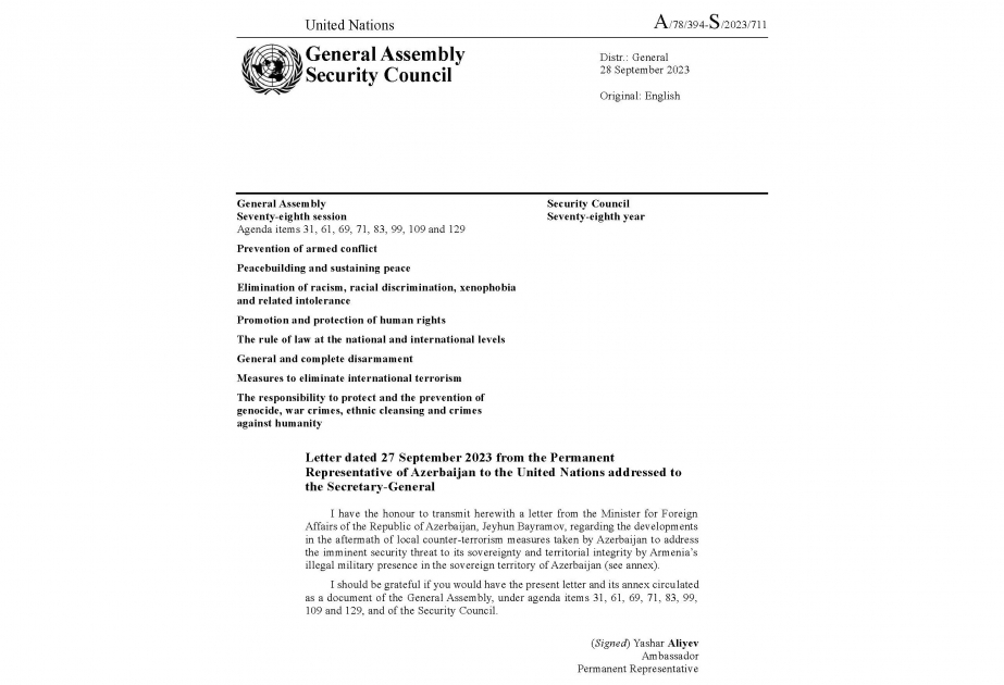 Xarici işlər naziri Ceyhun Bayramovun ölkəmiz tərəfindən Azərbaycanın Qarabağ bölgəsində aparılmış lokal xarakterli antiterror tədbirlərinin nəticələri, ərazilərdə qanunsuz fəaliyyətini davam etdirən erməni silahlı qüvvələrinin tərksilah edilməsinə dair sentyabrın 27-də BMT Baş katibinə ünvanlandığı məktub və tərk-silah prosesi çərçivəsində təslim edilmiş silah və sursatların fotoşəkillərini əks etdirən əlavə məlumat BMT Təhlükəsizlik Şurasının və Baş Assambleyasının sənədləri kimi yayılıb.
