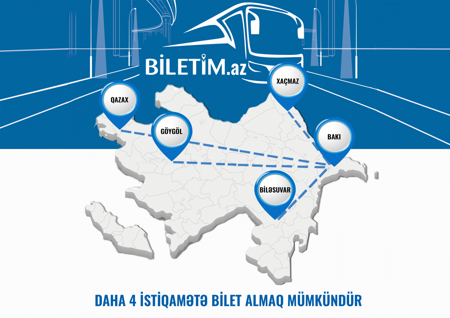 Rəqəmsal İnkişaf və Nəqliyyat Nazirliyinin Mətbuat xidmətindən verilən məlumata görə, sərnişinlər artıq Bakıdan Göygöl, Qazax, Biləsuvar və Xaçmaza, eləcə də əks istiqamətə hərəkət edən avtobuslara onlayn bilet ala bilərlər.