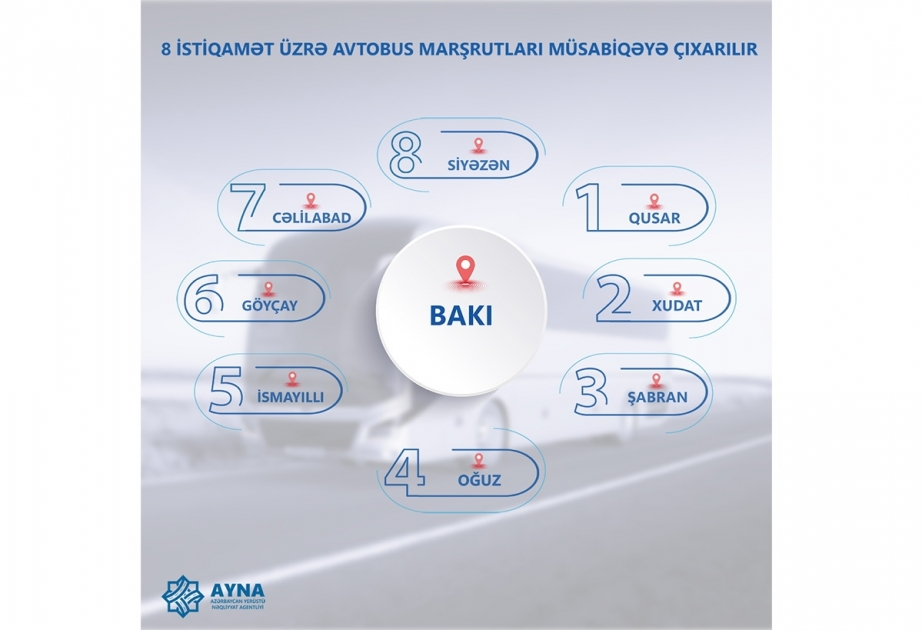 Azərbaycan Yerüstü Nəqliyyat Agentliyi (AYNA) şəhərlərarası sərnişindaşıma xidmətinin keyfiyyətinin artırılması ilə bağlı tədbirlər çərçivəsində Bakı-Şabran, Bakı-Oğuz, Bakı-Göyçay, Bakı-İsmayıllı, Bakı-Cəlilabad, Bakı-Siyəzən, Bakı-Qusar və Bakı-Xudat şəhərlərarası müntəzəm avtobus marşrutlarını müsabiqəyə çıxarır.