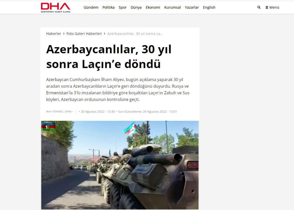 Məqalədə, həmçinin qeyd olunub ki, Laçın rayonu 10 noyabr 2020-ci il tarixli üçtərəfli bəyanat əsasında Azərbaycanın nəzarətinə geri qaytarılıb.