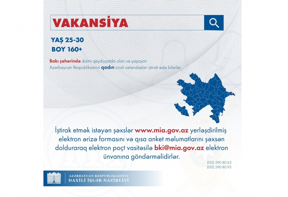 Daxili İşlər Nazirliyi (DİN) operator vəzifələri üzrə müvafiq qurumlarında vakant olan sıravi və kiçik rəis heyəti vəzifələrinə xidmətə qəbulla əlaqədar müsabiqə elan edir.
