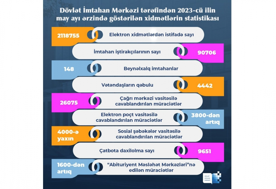 Mərkəzdən bildirilib ki, may ayında keçirilmiş imtahanlarda 90 min 706 nəfər iştirak edib. Mərkəzin elektron xidmətlərindən istifadə sayı 2 milyon 118 min 755 olub. May ayı ərzində 4442 vətəndaş qəbul edilib. Beynəlxalq imtahanlarda 148 nəfər iştirak edib. Çağrı Mərkəzi vasitəsilə 26 min 75, elektron poçt vasitəsilə 3800-dən artıq, sosial şəbəkələr vasitəsilə 4000-ə yaxın müraciət cavablandırılıb. Çatbota daxilolma sayı 9651 olub. Abituriyent məsləhət mərkəzlərinə 1600-dən çox müraciət olub.