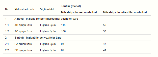 Azərbaycan Respublikasının Tarif (qiymət) Şurasının 2022-ci il 26 iyul tarixli 5 nömrəli qərarına əsasən “Dövlət qulluğu sertifikatı”nın qüvvədə olma müddətinin hər ili ərzində beşdən artıq müsahibədə iştirak üçün ödənişin məbləği dövlət qulluğu vəzifələrinin növlərinə müvafiq olaraq test imtahanı tariflərinin 50% miqdarında olmaqla aşağıdakı kimi müəyyən edilmişdir: