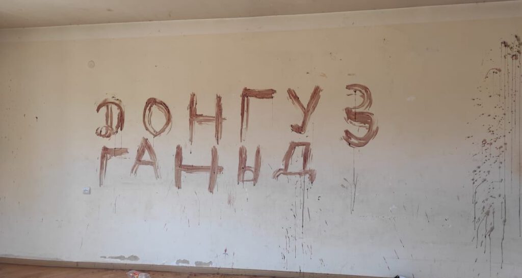 Evləri tərk etmiş ermənilərə növbəti dəfə dini inancları təhqir edərək öz əməllərini icra ediblər. Donuz qanı ilə evin divarına yazı yazan ermənilər bunla kifayətlənməyərək, heyvanın hissələrini də evin tavanından asıb.