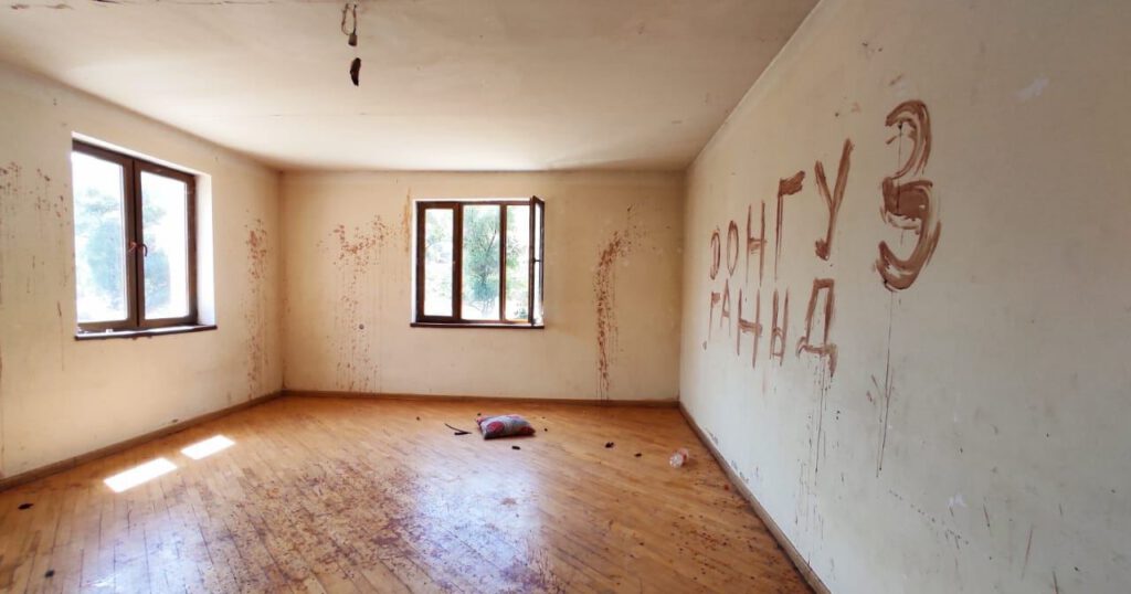 Laçın rayonunun Zabux kəndini tərk edən erməni ailəsi evin divarlarına donuz qanı sürtüb, hissələrini isə evdən asıblar.