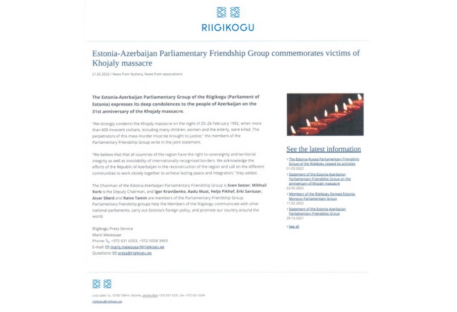 Estoniya parlamentinin (Riigikogu) Estoniya-Azərbaycan parlamentlərarası dostluq qrupu Xocalı soyqırımının 31-ci ildönümü ilə bağlı bəyanat yayıb.