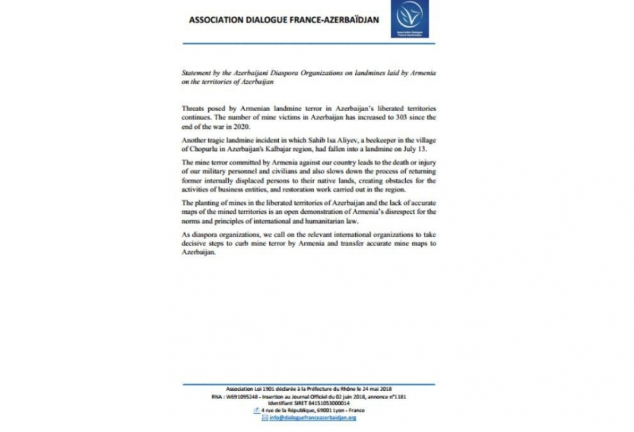 Fransada fəaliyyət göstərən Fransa-Azərbaycan Dialoqu Assosiasiyası ölkəmizin işğaldan azad edilmiş ərazilərində Ermənistanın mina təhlükəsi yaratması ilə bağlı növbəti dəfə dərin narahatlığını bəyan edib.