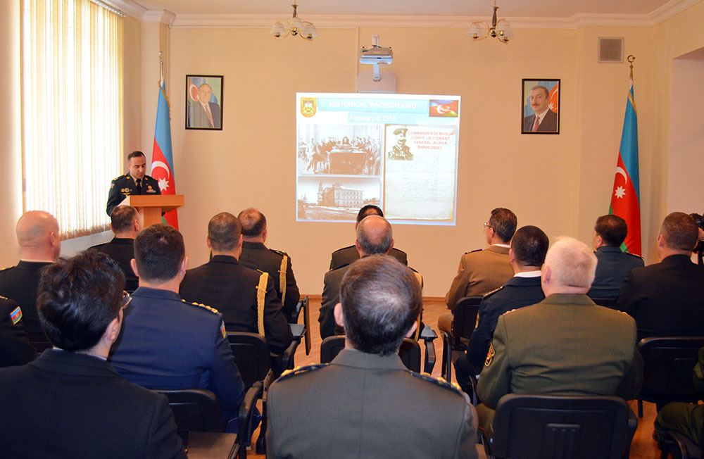 Xarici ölkələrin hərbi nümayəndələrinə xüsusi təyinatlı təhsil müəssisəsinin tarixi və fəaliyyəti barədə brifinq təqdim olunub. Qonaqlara, həmçinin görüşün bədii hissəsində hərbi orkestrin ifa etdiyi musiqi kompozisiyaları ərmağan edilib.