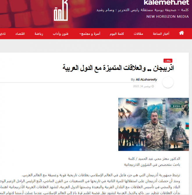 İraqlı professor, Qafqaz məsələləri üzrə ixtisaslaşmış tədqiqatçı Moataz Əbdül Həmidin “Azərbaycan və ərəb ölkələri: inkişaf edən əlaqələr” sərlövhəli məqaləsi bir sıra saytlarda dərc olunub.