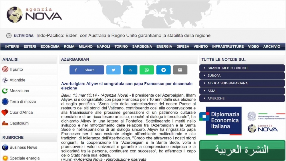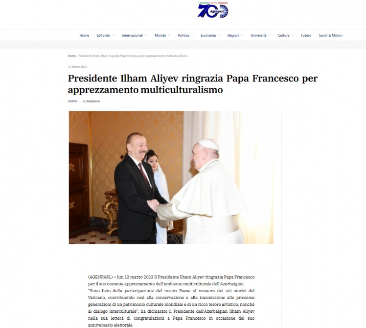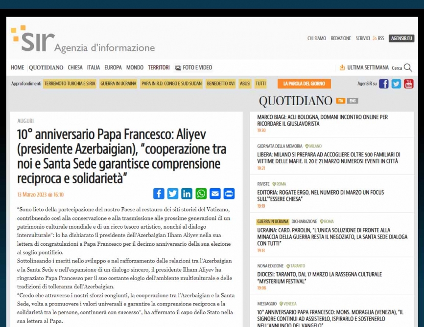 “Agenzia Nova”, “AgenSIR”, “Agenparl” kimi informasiya portallarında yayımlanan məlumatlarda Prezident İlham Əliyevin Roma Papası Fransiskə Tacqoyma Günü münasibətilə məktub ünvanlandığı qeyd olunub və məktubda yer alan fikirlərə diqqət çəkilib. Prezident İlham Əliyevin təbrik məktubunda Azərbaycan ilə Müqəddəs Taxt-Tac arasında münasibətlərin hazırkı səviyyəsindən məmnunluğunu ifadə etdiyini vurğuladığı bildirilib.