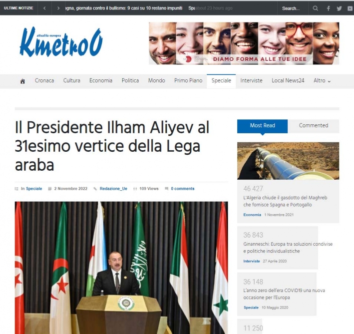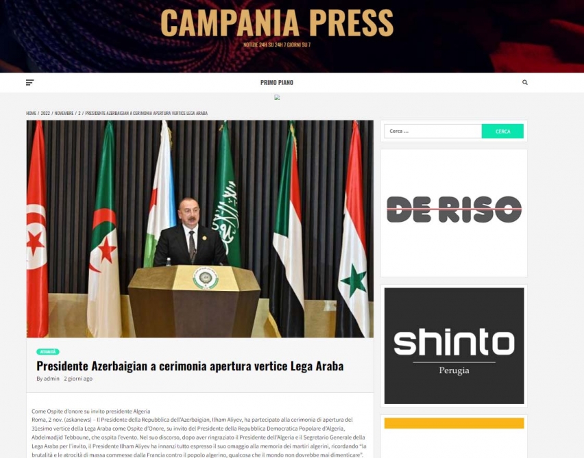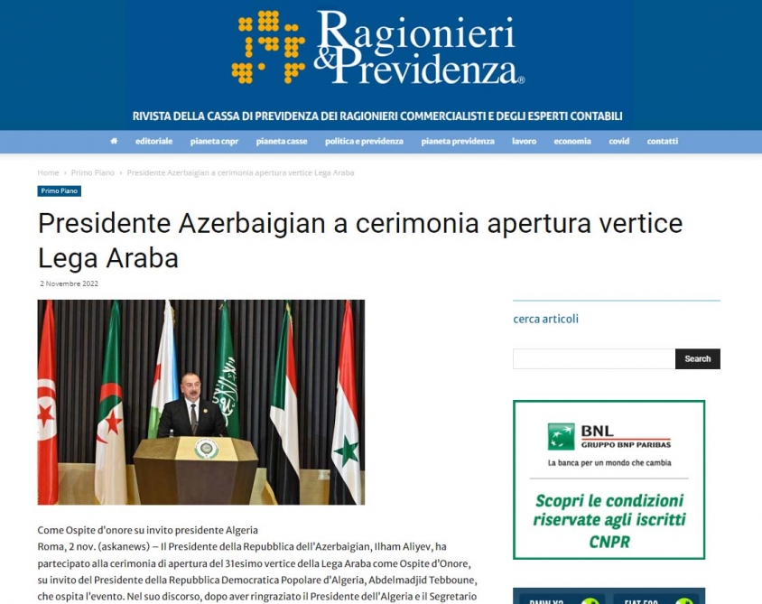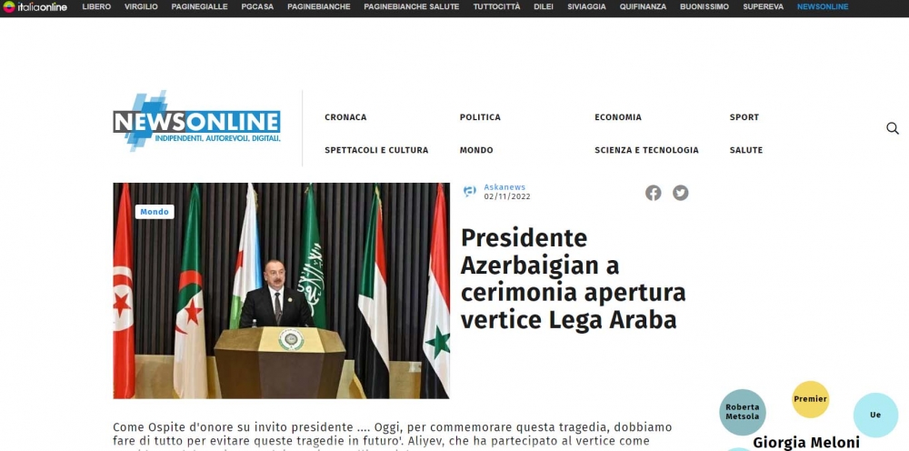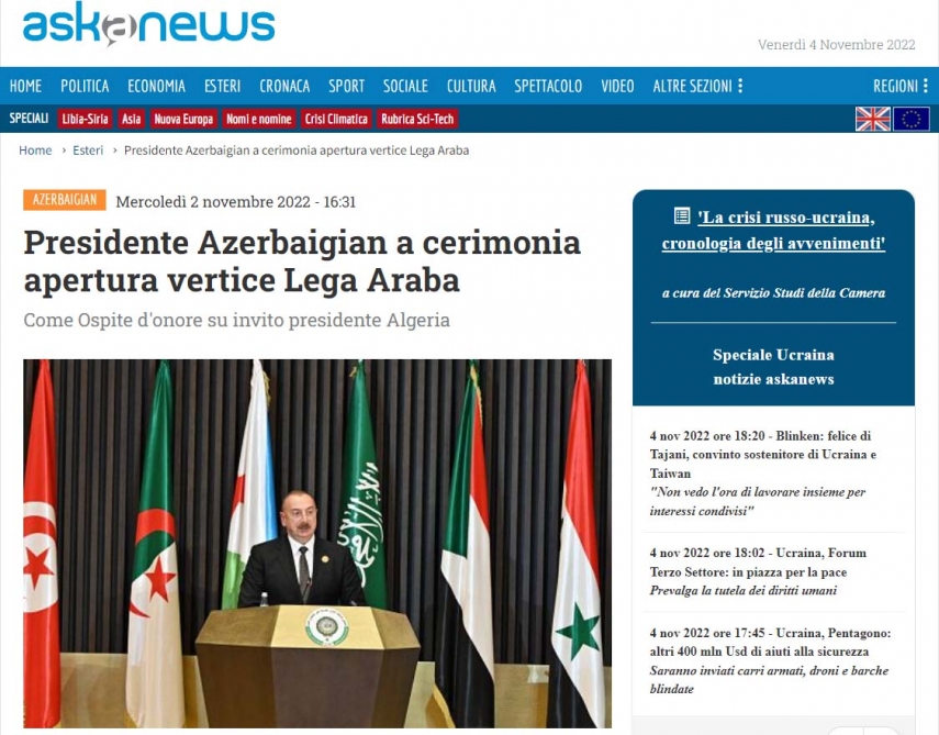 İtaliyanın aparıcı kütləvi informasiya vasitələri Azərbaycan Prezidenti İlham Əliyevin Əlcəzairdə keçirilən Ərəb Dövlətləri Liqasının 31-ci Zirvə toplantısında iştirakına geniş diqqət ayırıb.