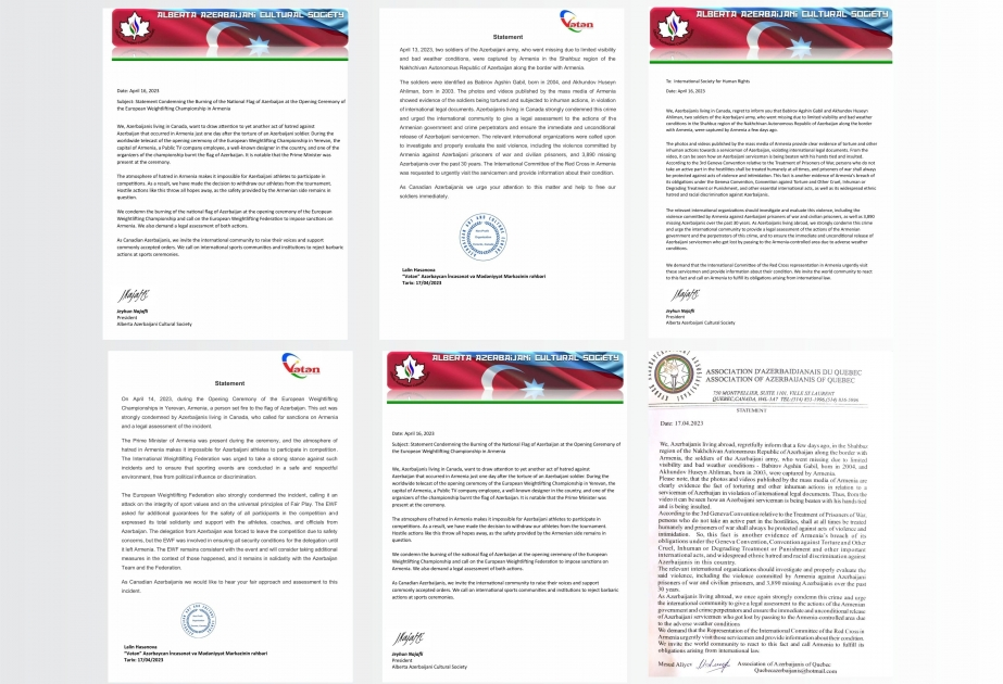 Diasporla İş üzrə Dövlət Komitəsindən bildiriblər ki, “Vətən” Azərbaycan İncəsənət və Mədəniyyət Mərkəzi, Ottavada “Qarabağ” Azərbaycan dili məktəbi, Kvebek Azərbaycanlıları Assosiasiyası, Alberta Azərbaycan Mədəniyyət Cəmiyyəti (ALACS), Kanadanın Azərbaycanlı Tələbələr Assosiasiyası adından beynəlxalq təşkilatlara ünvanlanan bəyanatda Azərbaycan Ordusunun iki əsgərinin Ermənistana əsir düşməsi səbəblərinə aydınlıq gətirilib. Azərbaycan əsgərinə verilən işgəncədən cəmi bir gün sonra Ermənistanda ölkəmizə qarşı etnik zəmində kök salmış nifrətin təcəssümü olan növbəti vandalizm aktının – Azərbaycan Bayrağının yandırılmasının baş verdiyinə diqqət cəlb edilib.