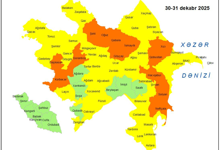 Bildirilib ki, Salyan, Neftçala, Hacıqabul, Qobustan, Şəki, Oğuz, Qəbələ, Göyçay, Xızı, İsmayıllı, Kəlbəcər, Goranboy, Daşkəsəndə narıncı xəbərdarlığa uyğun olaraq şimal-qərb küləyi əsəcək, küləyin sürəti saniyədə 20.8-28.4 metrədək güclənəcək.