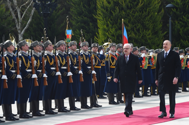 Fəxri qarovul dəstəsi hərbi marşın sədaları altında Azərbaycan Prezidenti İlham Əliyevin və Latviya Prezidenti Egils Levitsin qarşısından keçib.