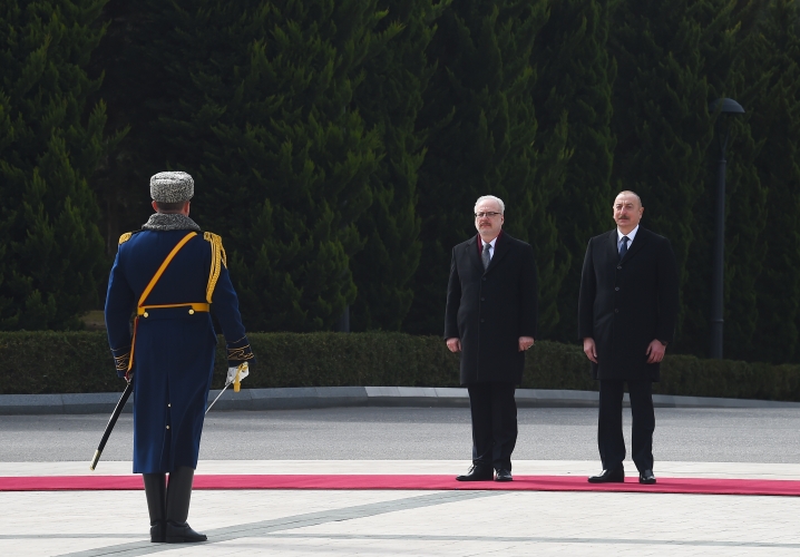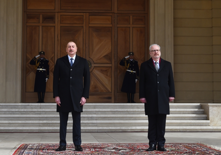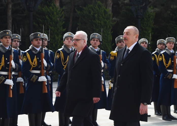 Hər iki ölkənin Dövlət bayraqlarının dalğalandığı meydanda Latviya Prezidentinin şərəfinə fəxri qarovul dəstəsi düzülüb.
