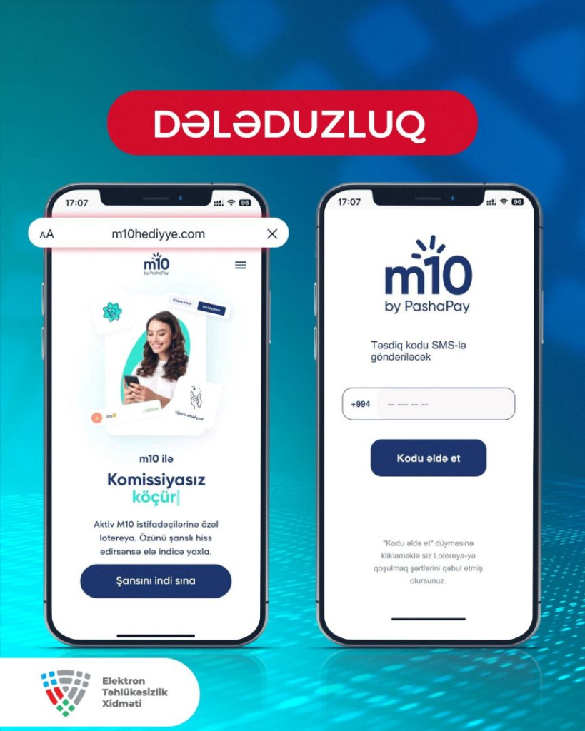 Sosial şəbəkələrdə “M10” onlayn ödəniş platforması adından uduşlu lotereyaların keçirilməsi ilə əlaqədar saxta reklamlar paylaşılır. Vətəndaşlardan lotereyada iştirak etmək üçün “m10hediyye.com” adlı saxta veb səhifəyə daxil olaraq mobil nömrələrini, daha sonra isə nömrəyə göndərilən təsdiq kodunu yazmaları tələb olunur.