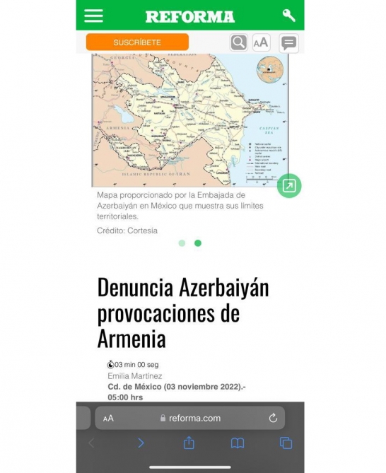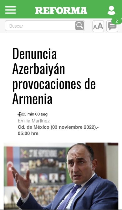 Meksikanın ən çox oxunan və nüfuzlu KİV-i olan “Reforma” qəzetində bu ölkədəki səfirimiz Məmməd Talıbovun Ermənistan silahlı qüvvələrinin genişmiqyaslı təxribatı ilə bağlı müsahibəsi dərc olunub.