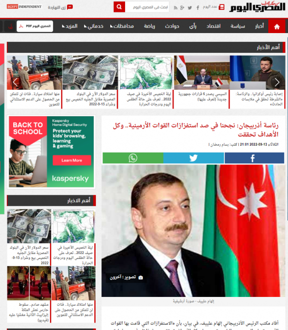 Misir mediasında dərc olunmuş məqalələrdə Azərbaycan Ordusunun Ermənistan silahlı qüvvələrinin sentyabrın 12-də gecə saatlarında sərhədyanı rayonlarda başlayan təxribatlarına qətiyyətli cavab verdiyi, düşmənin xeyli sayda canlı qüvvəsi və hərbi texnikasını məhv etdiyi vurğulanıb. Yazılarda bildirilib ki, Azərbaycan Prezidenti İlham Əliyev son hadisələrə görə məsuliyyətin Ermənistan rəhbərliyinin üzərinə düşdüyünü bəyan edib.