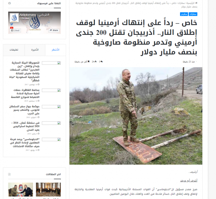 “Əl Masr Əl Yom” və “Əl Diplomasi” mətbu orqanlarında dərc olunmuş materiallarda vurğulanıb ki, təxribatçı erməni silahlı qüvvələrinə ağır zərbə vuran Azərbaycan, eyni zamanda, sülh çağırışları edərək birtərəfli humanitar atəşkəs təklif edib.