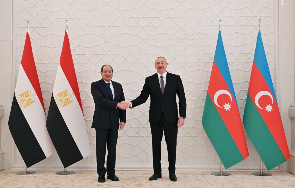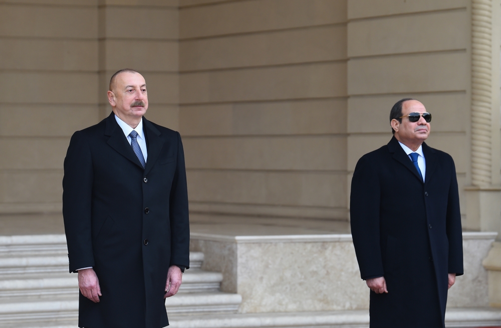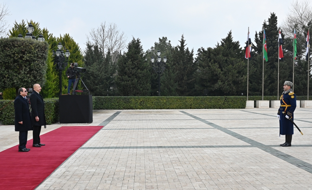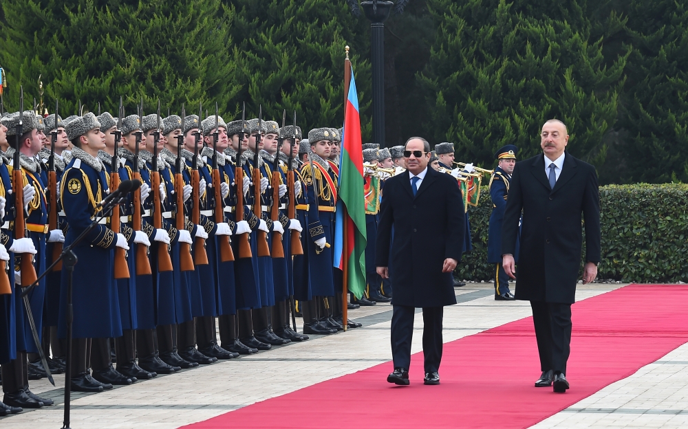 Hər iki ölkənin Dövlət bayraqlarının dalğalandığı meydanda Misir Prezidentinin şərəfinə fəxri qarovul dəstəsi düzülüb.