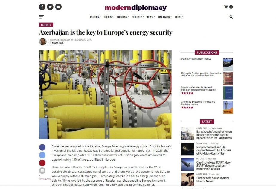 Avropada ictimai rəyin formalaşmasında aparıcı mənbələrdən sayılan “Modern Diplomacy” media platformasında “Azərbaycan Avropanın enerji təhlükəsizliyinin açarıdır” sərlövhəli məqalə dərc olunub.
