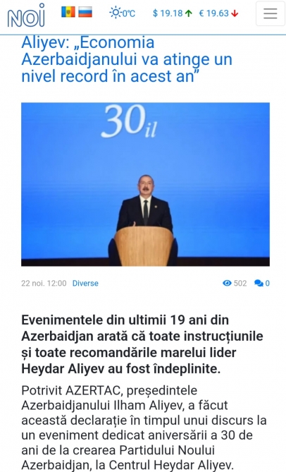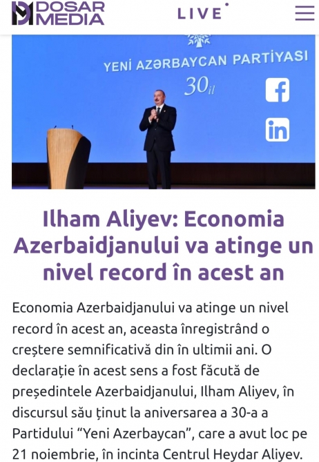 Moldovanın nüfuzlu xəbər saytları Azərbaycan Prezidenti İlham Əliyevin Yeni Azərbaycan Partiyasının (YAP) yaradılmasının 30 illiyi münasibətilə keçirilən tədbirdəki çıxışına geniş yer ayırıb.