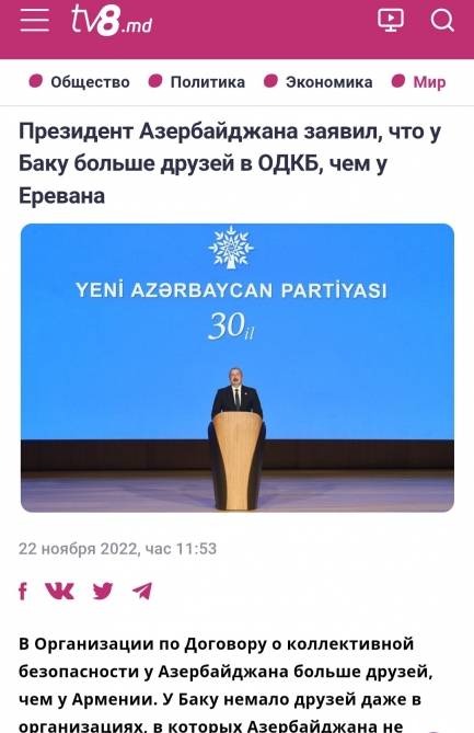 “Noi”, “TV8”, “Dosarmedia” və digər xəbər portallarında rumın və rus dillərində dərc edilən məqalələrdə Prezident İlham Əliyevin Ermənistana, Azərbaycan iqtisadiyyatının güclənməsinə dair fikirləri xüsusilə qeyd edilib. Məqalələrdə dövlətimizin başçısının sitatlarına istinadla vurğulanır ki, Azərbaycanın üzv olmadığı Kollektiv Təhlükəsizlik Müqaviləsi Təşkilatında ölkəmizin dostları Ermənistandan çoxdur. “Biz bu təşkilatın üzvü deyilik, Ermənistan bu təşkilatın üzvüdür və bu təşkilat xətti ilə Azərbaycana qarşı əsassız iddia qaldırmaq fikrində idi, faktiki olaraq bu təşkilata üzv olan ölkələri Azərbaycanla üz-üzə qoymaq istəyirdi. Bu, böyük təxribatdır və böyük cinayətdir.